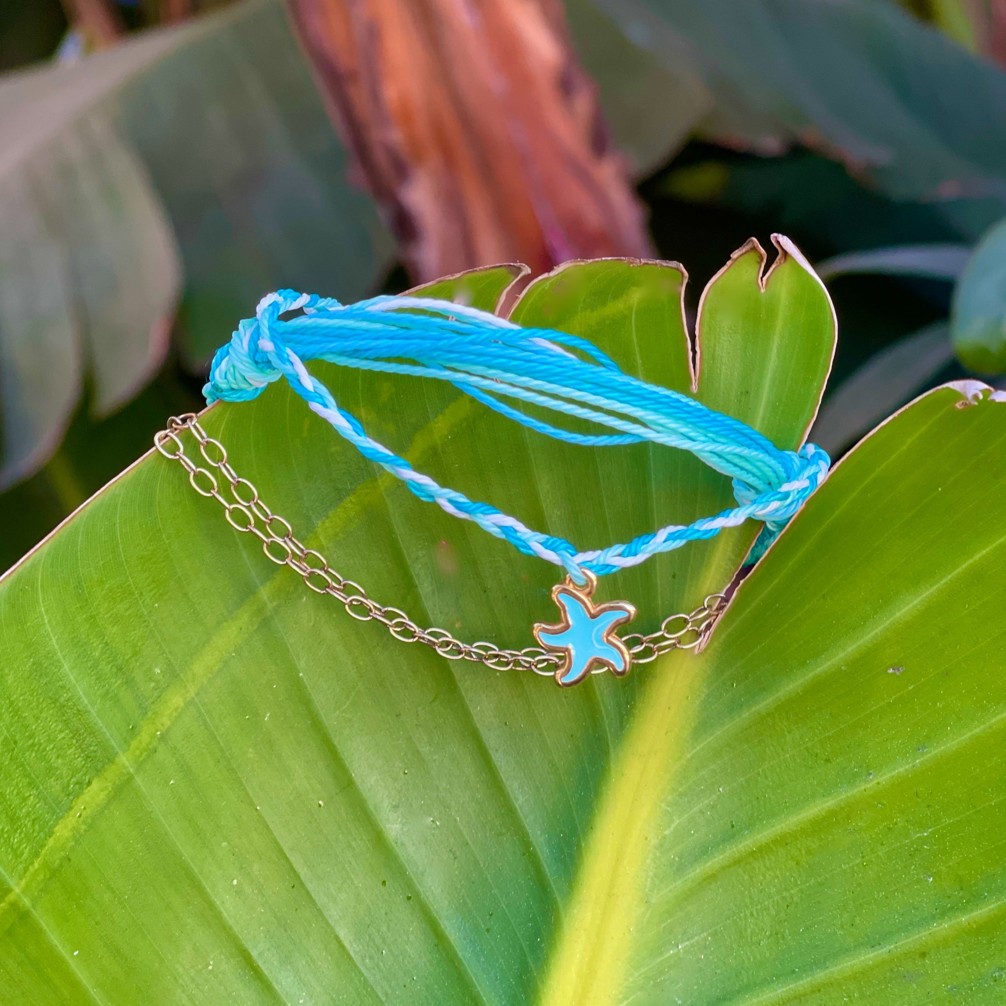 Cute Baby Starfish Arm Stack has braided Starfish Bracelet, Mixed Strings, and a cute Double Chain Bracelet...So cute paired with our White and Gold Cowrie Shell Bracelet or our Green and Blue Striped Bracelet! So Beachy!