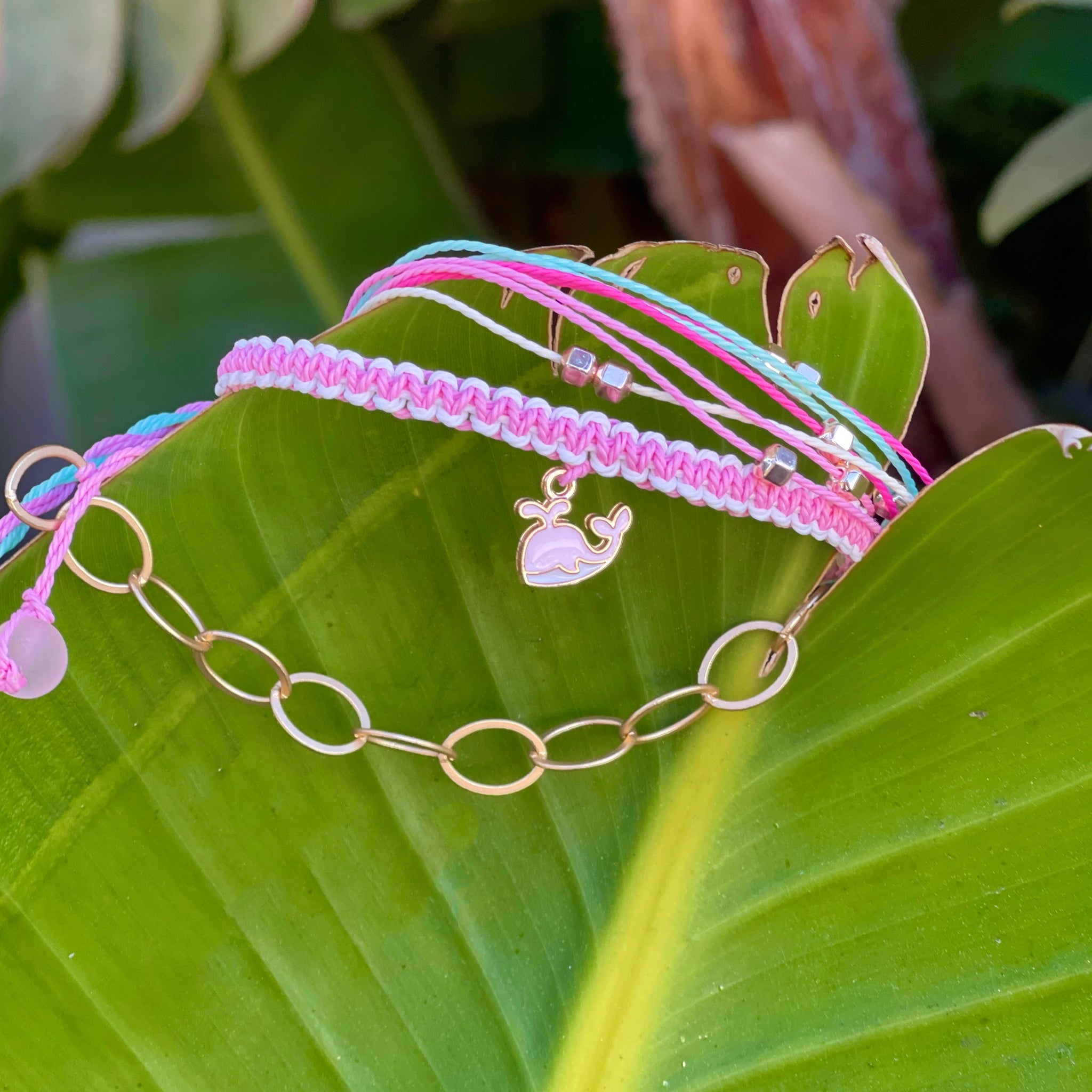 This cute bracelet is made up of 3 bracelets, a baby whale, mixed strings, and a pretty chain link, all adjustable waterproof twine, this little stack looks adorable paired with some of our other bracelets, such as the White and Gold Cowrie Shell bracelet! So cute for summer!