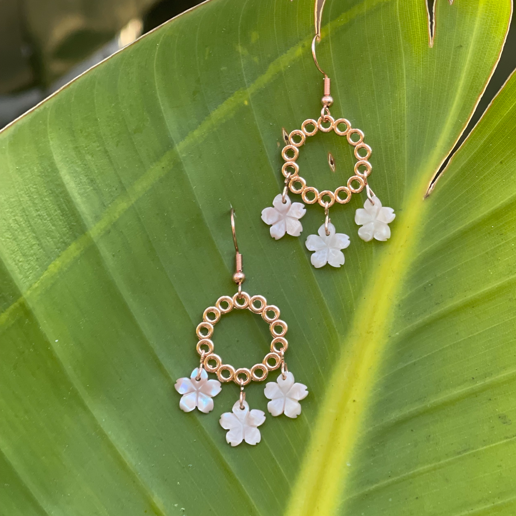 Another new FAVE -From our Hula Collection - These earrings come with little pink or white Mother of Pearl flowers that dangle beneath the round hoop earring. So pretty and fresh for summer!