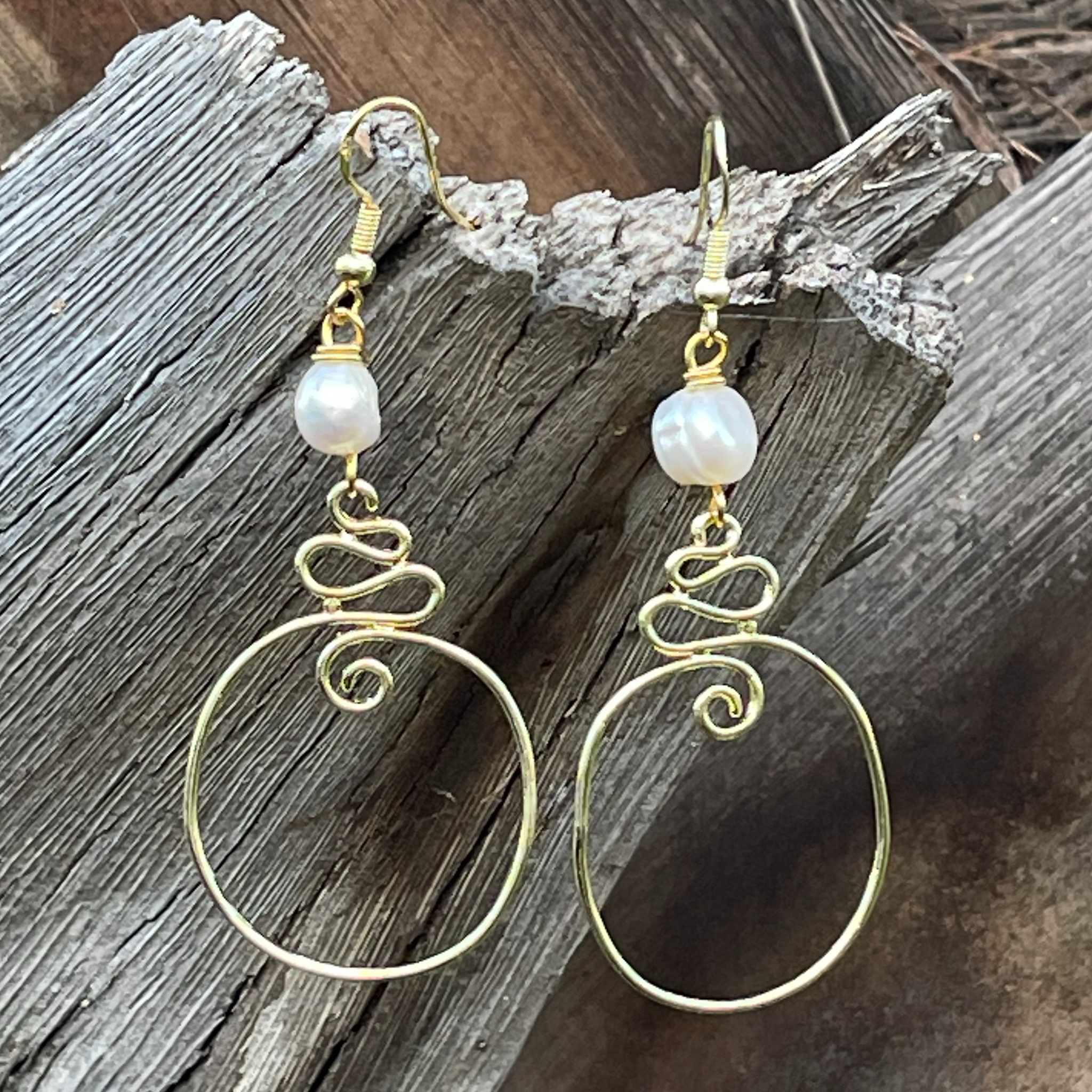 These are super pretty, golden, wavey, circles. They have a wire-wrapped freshwater pearl hanging from the top, middle , or below the circle. Very cool.