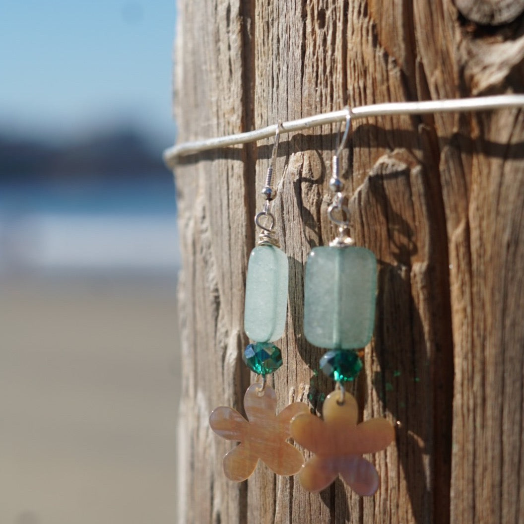 These cute little Mother of Pearl Flowers are underneath two very pretty green beads, one is crystal with lots of facets. Very pretty and Springy.