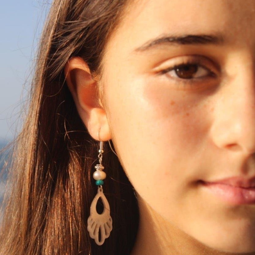 These beautiful drop earrings feature a Mother of Pearl blossom drop accented with a turquoise bead and a freshwater pearl. They are very lightweight and dangle about 2 inches from piercing. Very beautiful!