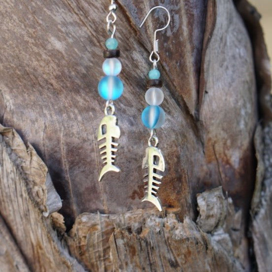 These cute earrings feature fish bones hanging from pretty fused glads beads, and coconut shell. Very cute!