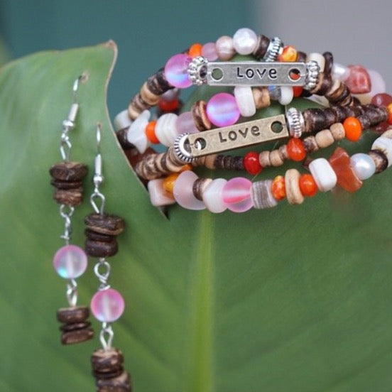 Cute on their own, these coconut shell and fused glass earrings pair swimmingly with our 3&4 strand bracelets. Great for your Fall wardrobe, while still keeping that beachy vibe.