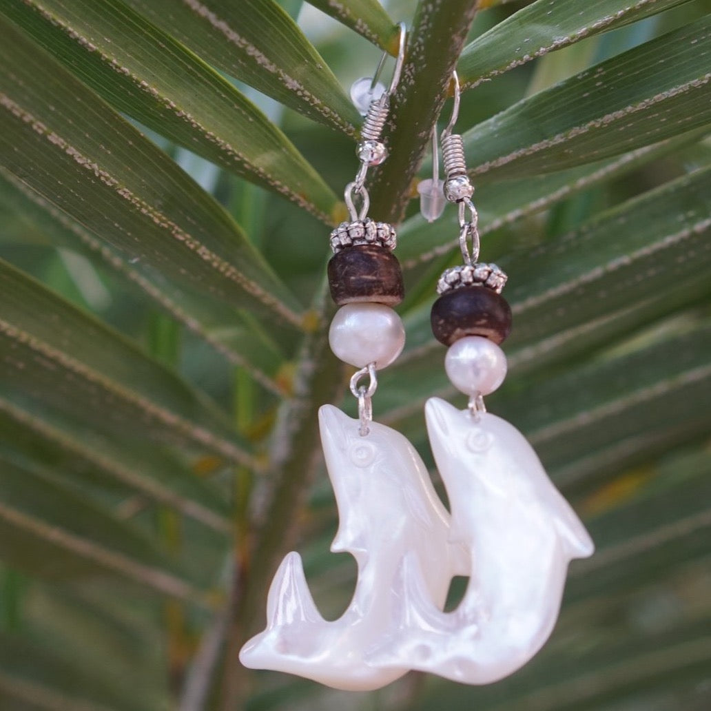 Adorable Mother of Pearl Dolphins hang from this little dangle earring. Bring a little bit of the Sea to your outfit!