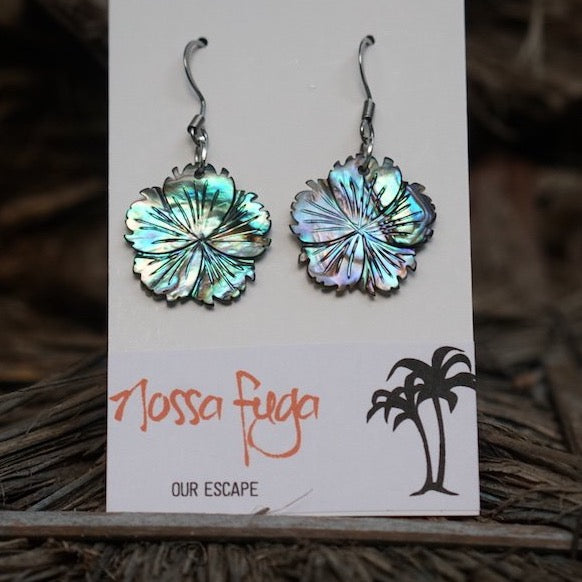 Our most popular earrings! These come in three sizes, small , medium, and large. The small and medium are made with 20 mm abalone flowers, while the large has a beautiful 30 mm flower dangling beneath beautiful fused glass beads, and coconut shell beads. Gorgeous with amazing colors in the sunlight!