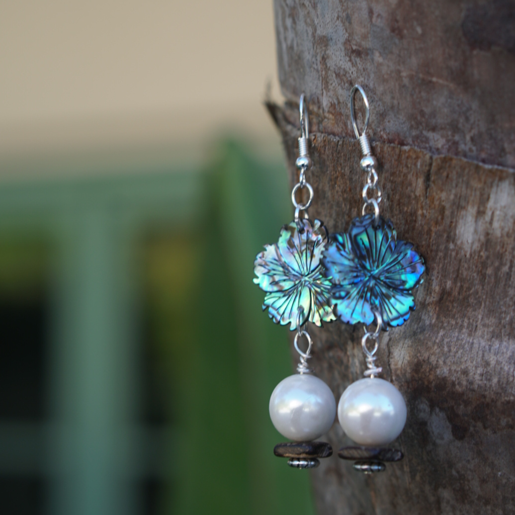 This beautiful abalone flower has a big wire wrapped pearl bead, (can be customized to a different color-(Pink -Blue-Aqua) and coconut bead that hangs beneath it. Cute, bouncy and tropical.  Abalone flower is 20mm. Earring hangs about 2 1/4 inches. Also available in the Big Abalone Flower, please message if interested in bigger flower.