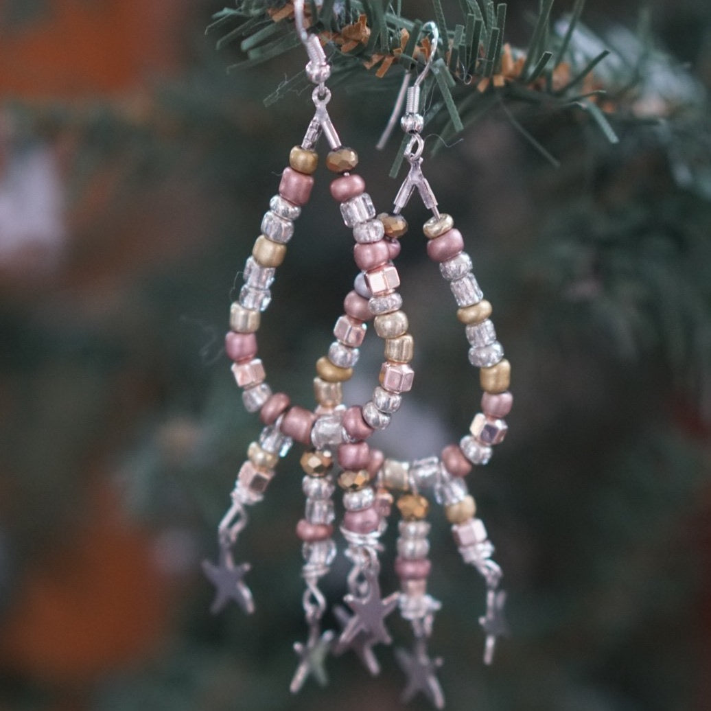 These cute dangling star teardrops are great for the holidays! Mixed metal colors, like our sparkling sands wrap bracelets, with dangling silver stars! Lightweight, sparkley, and festive!