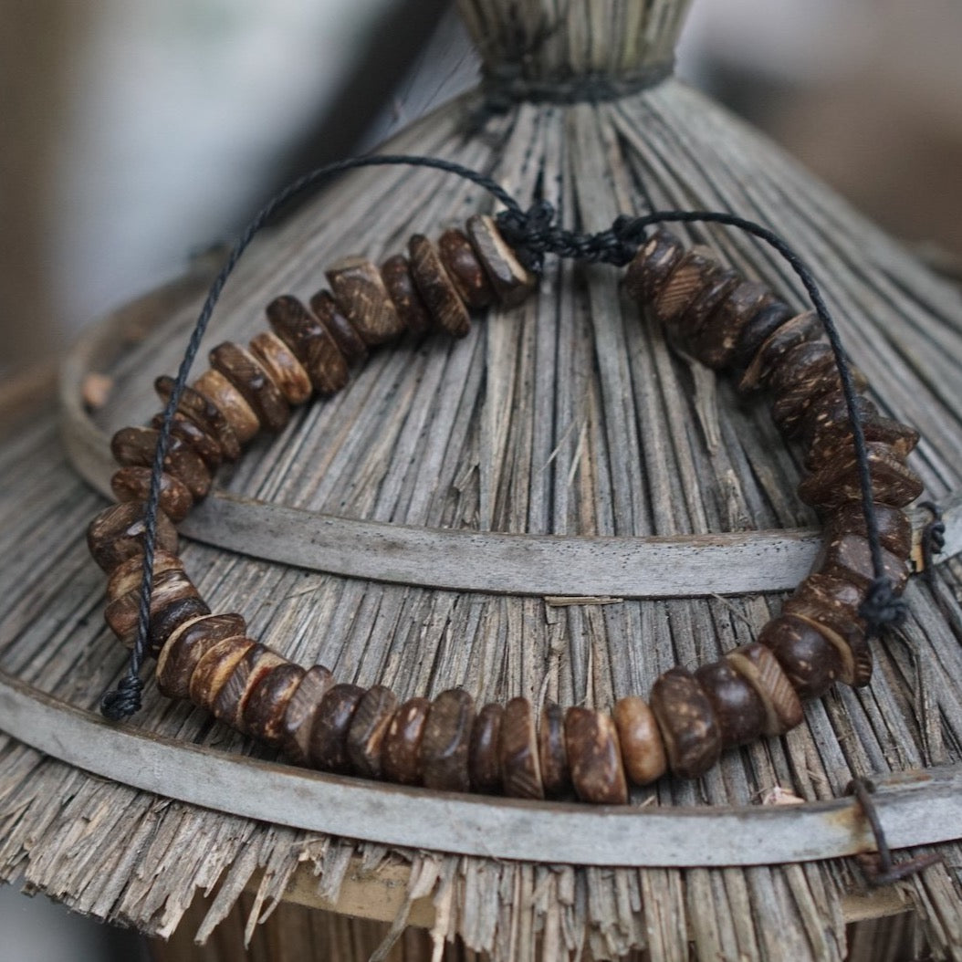 No, these "Kon Tiki" bracelets have nothing to do with the story.....They just look so Hawaiin! Made with coconut shells, beads, the cord is black, some have cowrie shells on the slide/tie adjustable closure. Can be made with or without charm. Plain available with just knots on the adjustable ties.