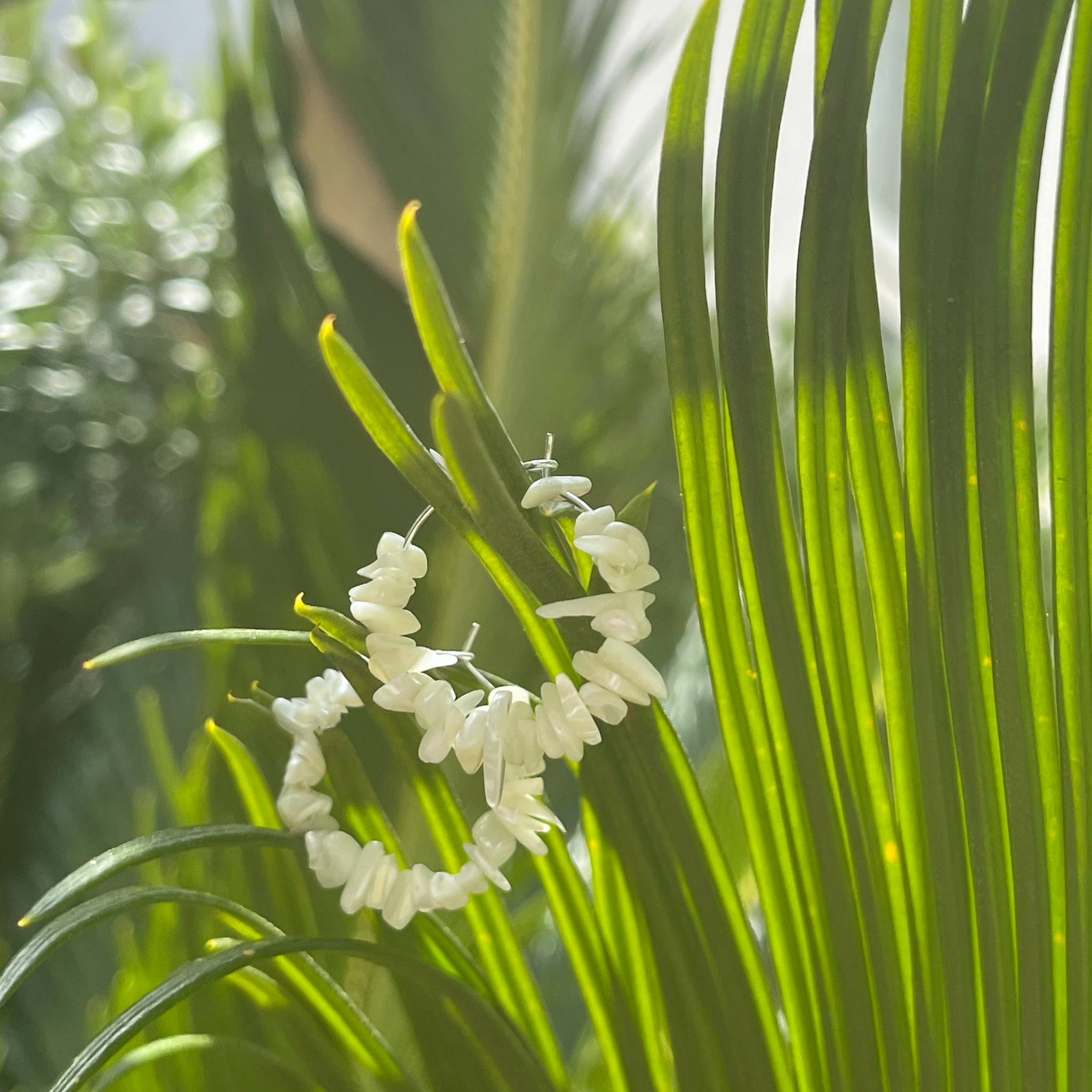 These tropical lil' hoops are made with Mother of Pearl beads......they're super cute and tropical...Lightweight, they come in 3 cute sizes! So tropical, for your beachy OOTD!